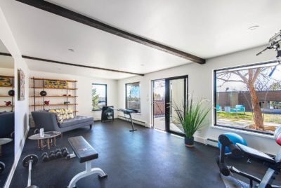 The first is the gym, measuring 26 x 14 feet, with cushioned floor, windows and sliding glass doors facing south, this is an enviable room for exercise, yoga, dance or myriad of other uses. Walking out to a covered patio and level, sheltered yard, with a nearby fenced kitchen garden, the grassy lawn is terrific for lounging, while the patio, with the deck above, offers an ideal covered space for outdoor activities, like ping-pong. A pathway leads across the lawn to the detached garage and carport – a perfect spot for storing and tinkering with the gear that often comes with the Boulder lifestyle.