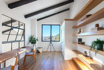 The nearby office is also magnificent, with similarly inspiring and delightful south and west facing views. This handsome space highlights an antique cast-iron glass-paned window overlooking the Great Room where eastern light and views are captured through the Great Room’s celestial windows. The opposite wall features built-in open shelving, masterly crafted in white oak, along with a storage closet.